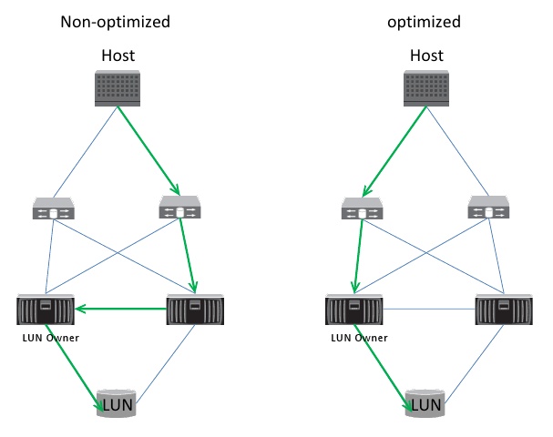 In the example on the left we can see that the storage path is not optimized. We found a perfectly acceptable path to the storage system but when we got there we found out that the other storage processor currently owned that LUN. At that point the storage processor can still access the LUN but has to go through the second storage process and thus is not optimized. ALUA makes sure that the most optimized path is always used.