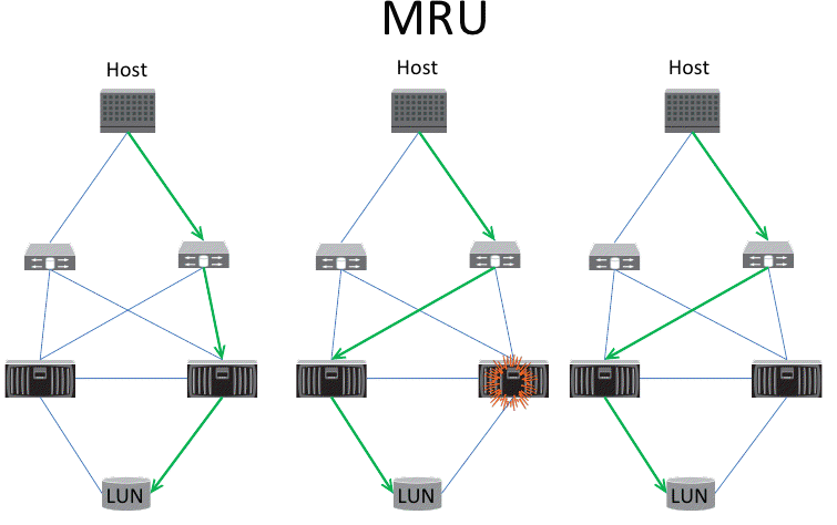 The host selects the path that it used most recently. When the path becomes unavailable, the host selects an alternative path. The host does not revert back to the original path when that path becomes available again. There is no preferred path setting with the MRU policy. MRU is the default policy for most active-passive storage devices.
