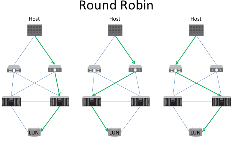 The host uses an automatic path selection algorithm rotating through all active paths when connecting to active-passive arrays, or through all available paths when connecting to active-active arrays. RR is the default for a number of arrays and can be used with both active-active and active-passive arrays to implement load balancing across paths for different LUNs.