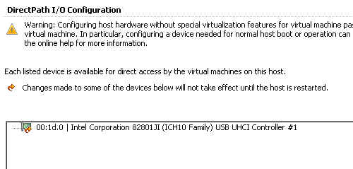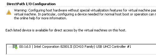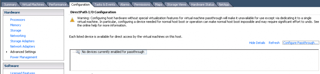 If this is the first time you’ve setup DirectPath I/O, you won’t see any devices listed. Click on the “Configure Passthrough…” hyperlink to take you to a list of devices that you can pass through to a virtual machine.