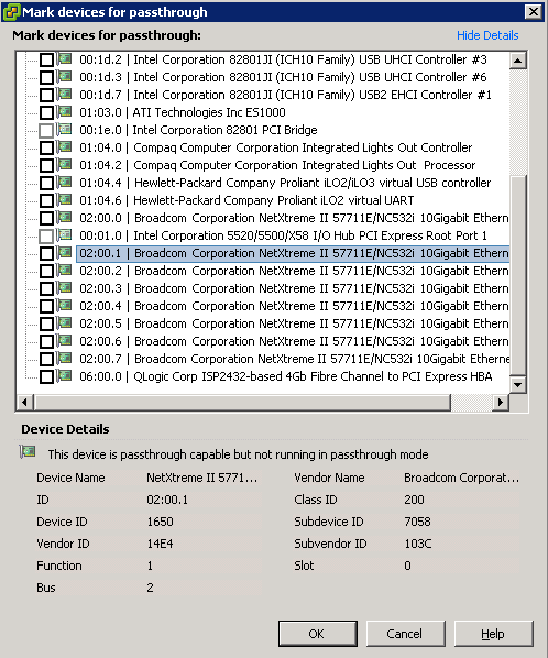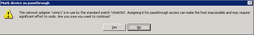 Select the device that you’re configuring passthrough on and click ok. Note: if you pick a device that ESXi is already using, you’ll be presented with a warning message. This might be very useful in the event that you accidentally pick the wrong device.