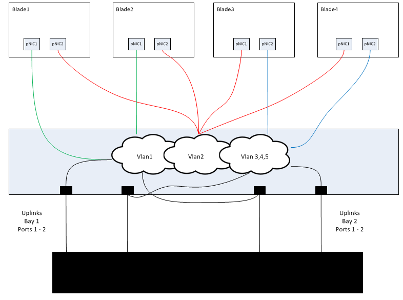 Let’s look at an example of a set of networks we’d like to build in our c7000 Chassis. In this example we have four blades. All of them should connect to VLAN2 which is a vMotion, Live Migration or some sort of cluster heartbeat network. Two of our blades will need to connect to a network called VLAN1 (yes I know this is a security concern, it’s just an example) which is a network used by servers other than in our blade chassis. And lastly, we have two blades that need access to three other networks, such as VLAN3, VLAN4, VLAN5 which are also used outside of the blade chassis.