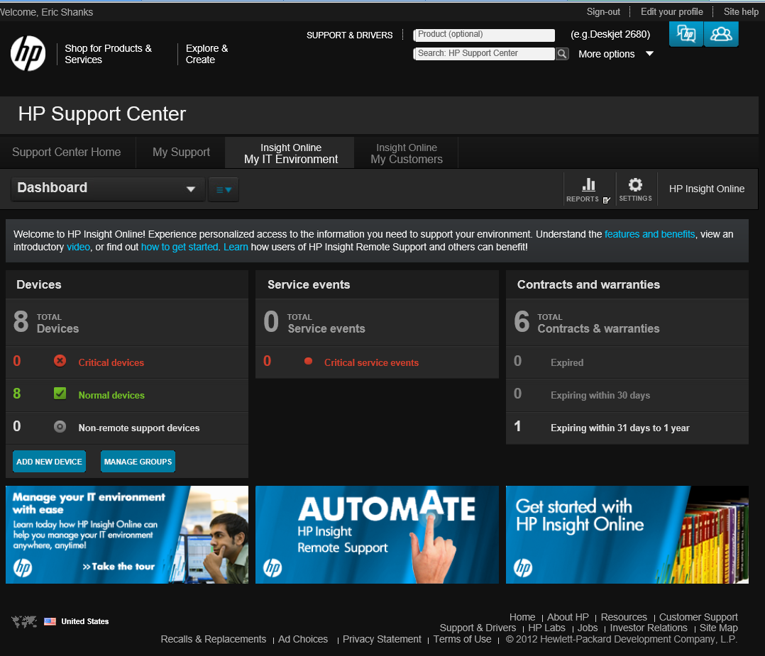 The HP Phone home product is called “HP Insight Remote Support” and is free for download. This product really doesn’t do a whole lot in your environment, but does exactly what you’d expect it to do. It scans your environment, monitors your equipment for errors and uploads that data to HP. All of your serial numbers are uploaded so that HP can determine if the equipment is under contract or warranty and could automatically create a ticket for you if you wish.