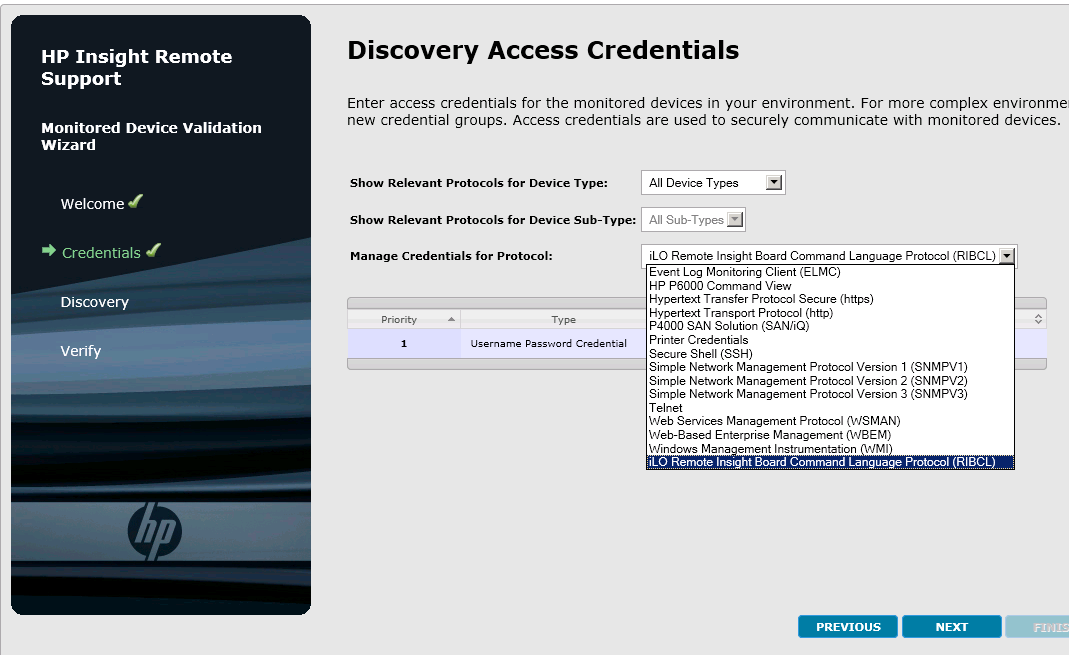 Add some credentials that will be used to log into the equipment. You’ll notice that you have options for SANiQ (lefthand OS), SNMP, Telnet, http(s), Command view etc. Make sure to add credentials for iLO Remote Insight Board Command Language (RIBCL). These are the credentials used to log into iLO which are important to get the serial numbers and health of your systems. More than one credential could be used for these and you can specify an order to which you’d like to have them tried during the discovery process.