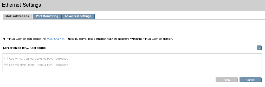 If you choose the “Virtual Connect Assigned MAC Addresses” option you will need to make sure that no other blade chasses are using the same range. Obviously network switches will not like having multiple devices on their network with the same MAC Addresses. To handle this, HP requires that you pic a range of addresses. You have 64 pre-defined ranges to choose from and they are listed below. (from the HP Support Docs) HP Pre-Defined MAC RangesMAC StartMAC EndHP Defined 100-17-A4-77-00-0000-17-A4-77-03-FFHP Defined 200-17-A4-77-04-0000-17-A4-77-07-FFHP Defined 300-17-A4-77-08-0000-17-A4-77-0B-FFHP Defined 400-17-A4-77-0C-0000-17-A4-77-0F-FFHP Defined 500-17-A4-77-10-0000-17-A4-77-13-FFHP Defined 600-17-A4-77-14-0000-17-A4-77-17-FFHP Defined 700-17-A4-77-18-0000-17-A4-77-1B-FFHP Defined 800-17-A4-77-1C-0000-17-A4-77-1F-FFHP Defined 900-17-A4-77-20-0000-17-A4-77-23-FFHP Defined 1000-17-A4-77-24-0000-17-A4-77-27-FFHP Defined 1100-17-A4-77-28-0000-17-A4-77-2B-FFHP Defined 1200-17-A4-77-2C-0000-17-A4-77-2F-FFHP Defined 1300-17-A4-77-30-0000-17-A4-77-33-FFHP Defined 1400-17-A4-77-34-0000-17-A4-77-37-FFHP Defined 1500-17-A4-77-38-0000-17-A4-77-3B-FFHP Defined 1600-17-A4-77-3C-0000-17-A4-77-3F-FFHP Defined 1700-17-A4-77-40-0000-17-A4-77-43-FFHP Defined 1800-17-A4-77-44-0000-17-A4-77-47-FFHP Defined 1900-17-A4-77-48-0000-17-A4-77-4B-FFHP Defined 2000-17-A4-77-4C-0000-17-A4-77-4F-FFHP Defined 2100-17-A4-77-50-0000-17-A4-77-53-FFHP Defined 2200-17-A4-77-54-0000-17-A4-77-57-FFHP Defined 2300-17-A4-77-58-0000-17-A4-77-5B-FFHP Defined 2400-17-A4-77-5C-0000-17-A4-77-5F-FFHP Defined 2500-17-A4-77-60-0000-17-A4-77-63-FFHP Defined 2600-17-A4-77-64-0000-17-A4-77-67-FFHP Defined 2700-17-A4-77-68-0000-17-A4-77-6B-FFHP Defined 2800-17-A4-77-6C-0000-17-A4-77-6F-FFHP Defined 2900-17-A4-77-70-0000-17-A4-77-73-FFHP Defined 3000-17-A4-77-74-0000-17-A4-77-77-FFHP Defined 3100-17-A4-77-78-0000-17-A4-77-7B-FFHP Defined 3200-17-A4-77-7C-0000-17-A4-77-7F-FFHP Defined 3300-17-A4-77-80-0000-17-A4-77-83-FFHP Defined 3400-17-A4-77-84-0000-17-A4-77-87-FFHP Defined 3500-17-A4-77-88-0000-17-A4-77-88-FFHP Defined 3600-17-A4-77-8C-0000-17-A4-77-8F-FFHP Defined 3700-17-A4-77-90-0000-17-A4-77-93-FFHP Defined 3800-17-A4-77-94-0000-17-A4-77-97-FFHP Defined 3900-17-A4-77-98-0000-17-A4-77-9B-FFHP Defined 4000-17-A4-77-9C-0000-17-A4-77-9F-FFHP Defined 4100-17-A4-77-A0-0000-17-A4-77-A3-FFHP Defined 4200-17-A4-77-A4-0000-17-A4-77-A7-FFHP Defined 4300-17-A4-77-A8-0000-17-A4-77-AB-FFHP Defined 4400-17-A4-77-AC-0000-17-A4-77-AF-FFHP Defined 4500-17-A4-77-B0-0000-17-A4-77-B3-FFHP Defined 4600-17-A4-77-B4-0000-17-A4-77-B7-FFHP Defined 4700-17-A4-77-B8-0000-17-A4-77-BB-FFHP Defined 4800-17-A4-77-BC-0000-17-A4-77-BF-FFHP Defined 4900-17-A4-77-C0-0000-17-A4-77-C3-FFHP Defined 5000-17-A4-77-C4-0000-17-A4-77-C7-FFHP Defined 5100-17-A4-77-C8-0000-17-A4-77-CB-FFHP Defined 5200-17-A4-77-CC-0000-17-A4-77-CF-FFHP Defined 5300-17-A4-77-D0-0000-17-A4-77-D3-FFHP Defined 5400-17-A4-77-D4-0000-17-A4-77-D7-FFHP Defined 5500-17-A4-77-D8-0000-17-A4-77-DB-FFHP Defined 5600-17-A4-77-DC-0000-17-A4-77-DF-FFHP Defined 5700-17-A4-77-E0-0000-17-A4-77-E3-FFHP Defined 5800-17-A4-77-E4-0000-17-A4-77-E7-FFHP Defined 5900-17-A4-77-E8-0000-17-A4-77-EB-FFHP Defined 6000-17-A4-77-EC-0000-17-A4-77-EF-FFHP Defined 6100-17-A4-77-F0-0000-17-A4-77-F3-FFHP Defined 6200-17-A4-77-F4-0000-17-A4-77-F7-FFHP Defined 6300-17-A4-77-F8-0000-17-A4-77-FB-FFHP Defined 6400-17-A4-77-FC-0000-17-A4-77-FF-FF