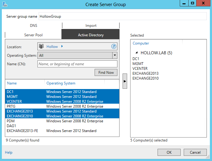 If you click the “Create a server group” link, a new dialog box will open and show you what servers are currently in the server pool. Slide over to the Active Directory Tab.