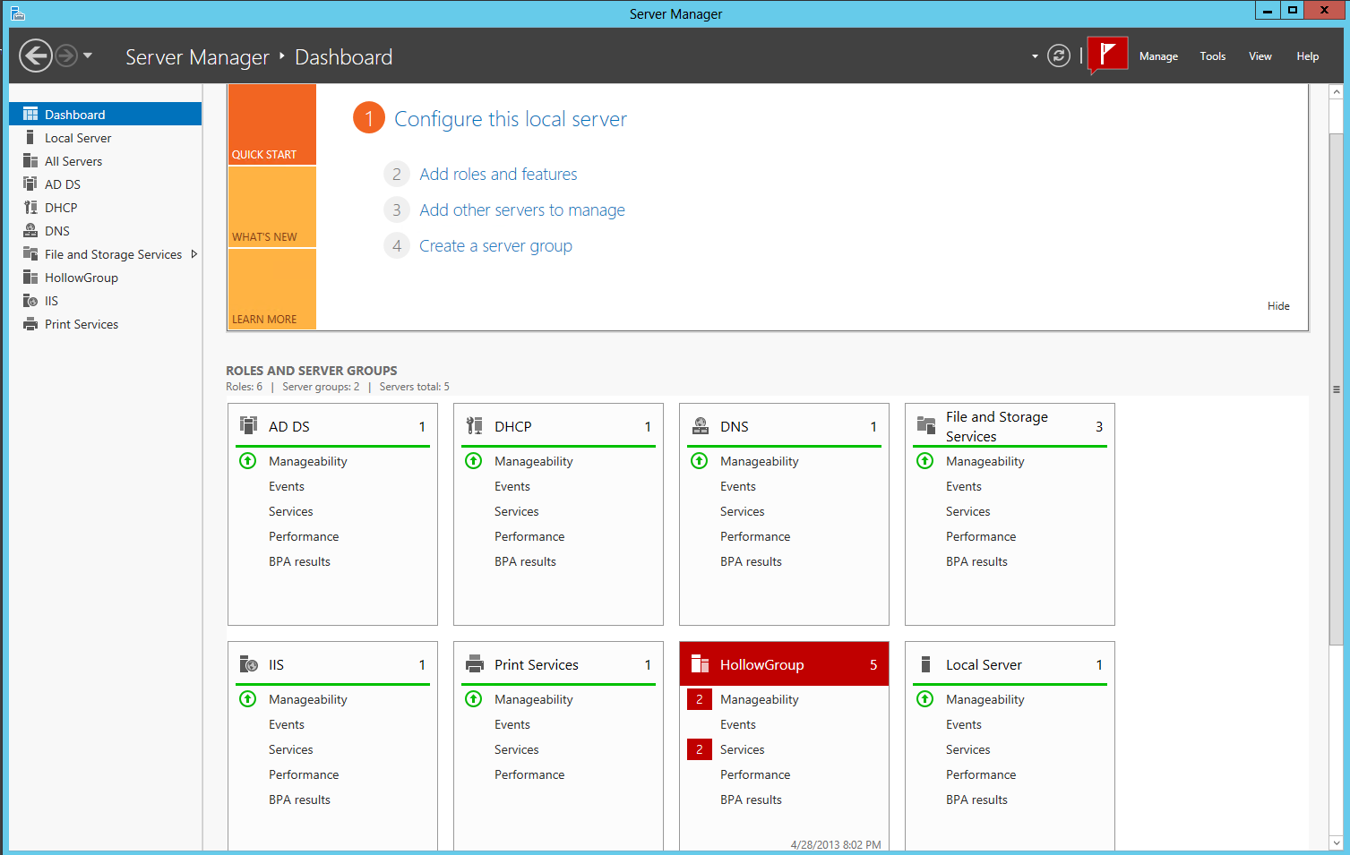 One of the new features in the latest version of Windows Server is the ability to create server groups. When you open the server manager you’ll see some server group options on the dashboard. You can add other servers to manage, or create a new group. Also, pay attention to the “Roles and Server Groups” section at the bottom of the screen which shows some of the server groups that were already set up.