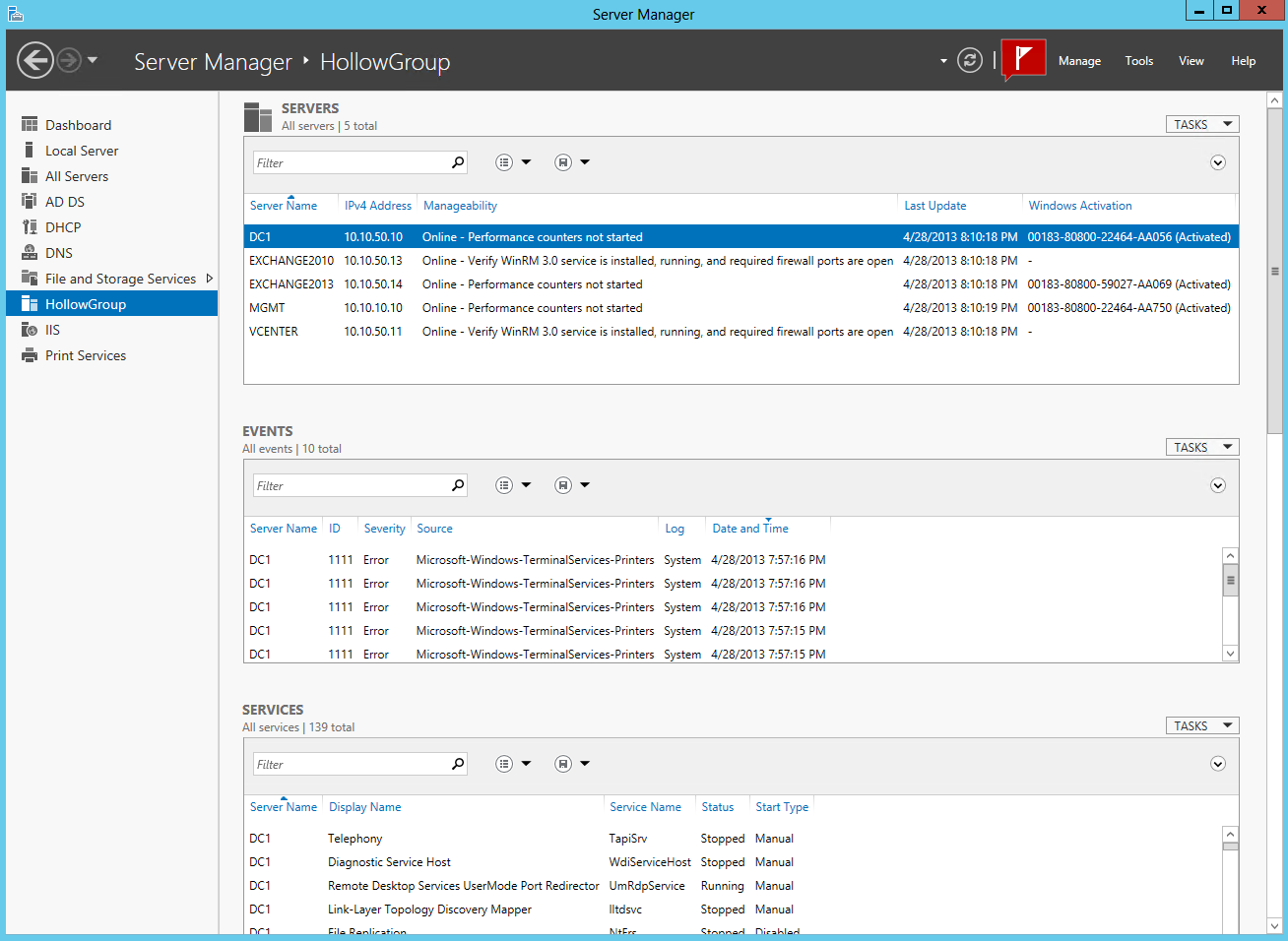 If you click on the newly created card, you’ll get some more detailed information about the servers is that group. In my case, you’ll notice I have an alarm listed and that’s because the server manager can’t communicate with a couple of my servers in the group (They’re 2008R2 servers and not Server 2012). To use Windows Server 2008R2 servers in your group, you want to make sure that WinRM 3.0 is installed and running.