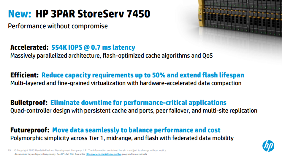 The new 3PAR is an all flash array that can be utilized for small, medium or large business needs. HP is touting that some of their competitors are having difficulty with the flash hurdle because their systems were optimized for spinning disks. And other competitors who designed their arrays specifically with flash in mind from the ground up are not proven arrays from a reliability standpoint.
