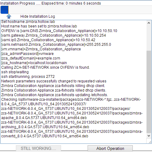 You’ll see a variety of things happening in the background. Grab a cup of coffee and wait for the setup to finish. I will mention that I did have an issue with this process the first time I went through it and found that I needed to be sure to have an A record and an MX record setup to point to the appliance before this step.