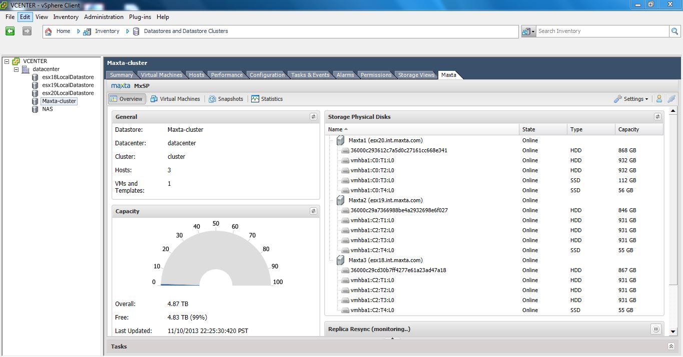 Maxta takes local storage on your ESXi hosts and creates a VMware datastore out of it. At first glance it’s hard not to immediately compare it to VMware new VSAN solution that is coming soon. Aside from the fact that Maxta is available right now, there are some other major differences.