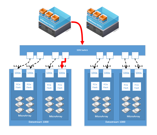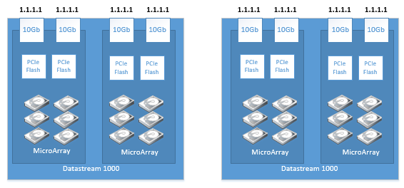 If we had two datastream 1000’s there would be 8 10Gb NICS that all have the same IP address, as shown below in my crude diagram.