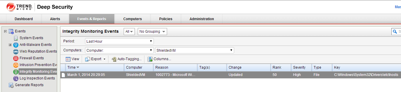 To test things, out, I make a modification to the hosts file on the “SheildedVM” and within 5 minutes I have an alert in the “Events & Reports” tab. Pretty slick stuff here!