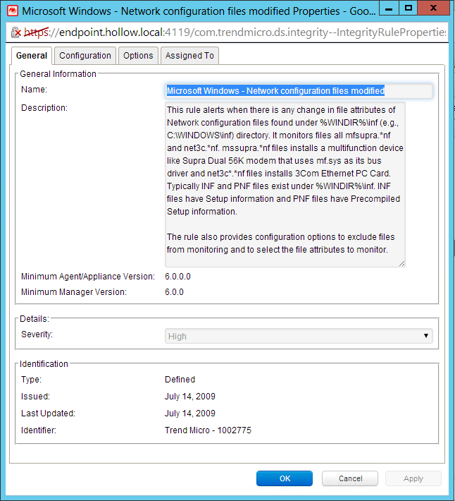 I found the “Network Configuration files modified” rule as my test. The rule can be found below, but basically it states that if I change my hosts file, I should be alerted. As a Systems Administrator this is a very valuable thing to know about because changes to host files are good sign of an attack.