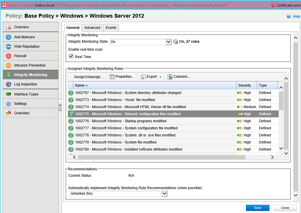 I opened the “Windows Server 2012” policy to get started. You’ll notice that you can change Firewall, IPS, Malware and log inspection policies to meet your organization’s security policies. I dove into the Integrity Monitoring section as an example.