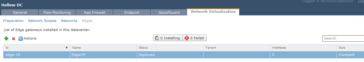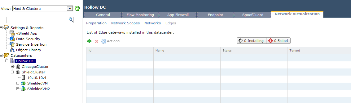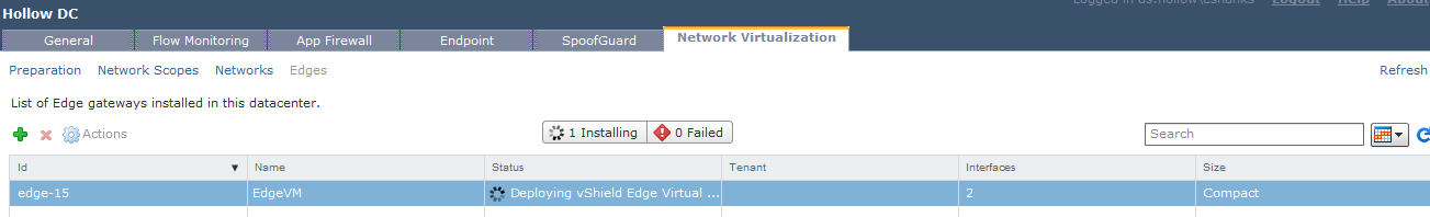 Now that the vCNS services are ready to go, we can deploy the edge services. Go to your vCNS portal, select your datacenter, and then go to the “Network Virtualization” tab.