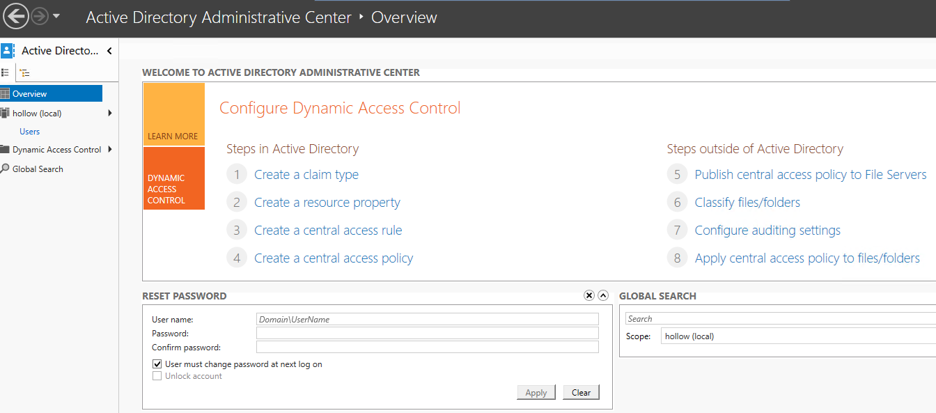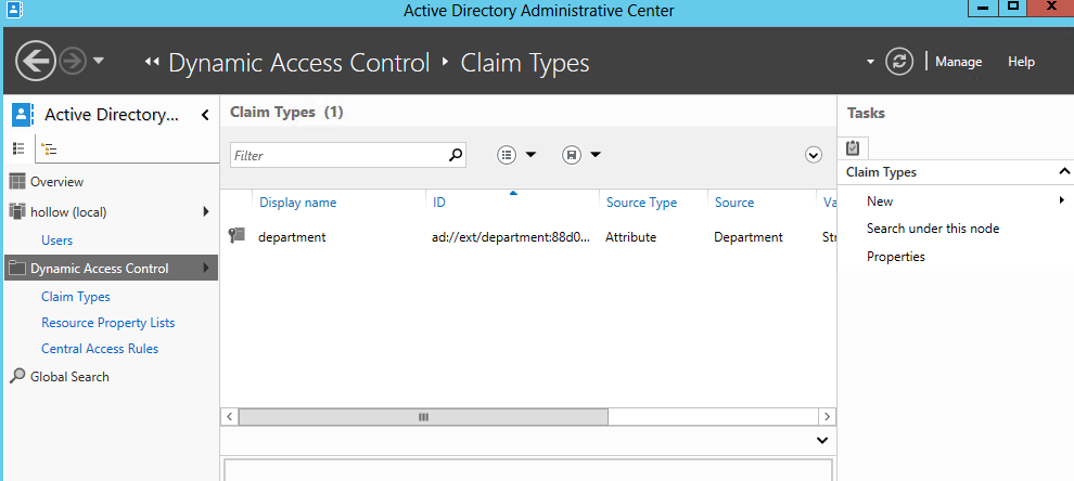 Setting up claims is done from the Active Directory Administrative Center (ADAC). Click the Dynamic Access Control (DAC) tile and you’ll notice a series of steps. Create a claim type is the first step. Click the hyperlink and you’ll be taken to the correct window, or use the Dynamic Access Control link on the menu and choose claim type.