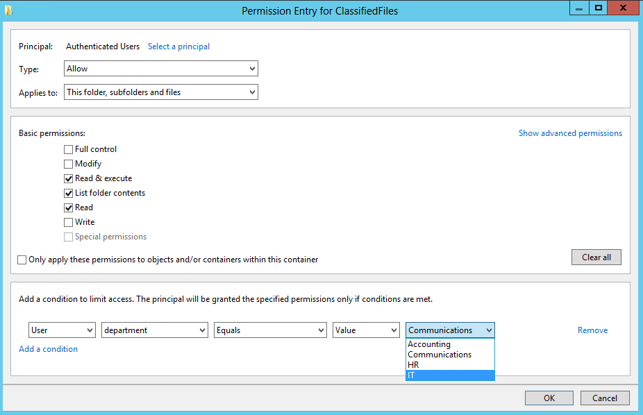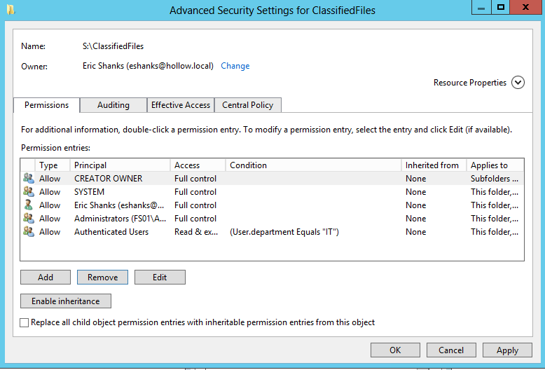 Now that we have a claim created, lets modify the security of a folder to allow access to anyone in the IT Department.