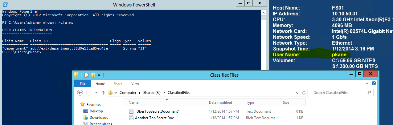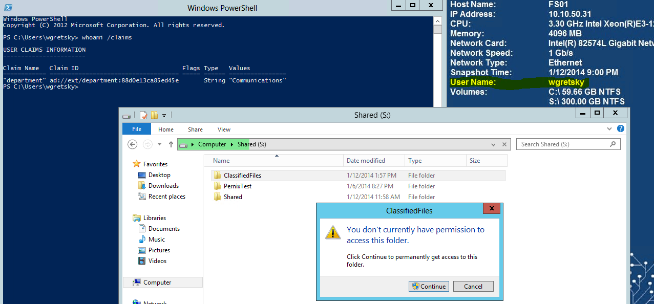 When I log as Mr. Gretzky, he does not have access to the folder and receives an access denied message. We can also verify this user’s claims by utilizing the whoami /claims command form a powershell window. I’ve included this in the screenshot to prove out our example.