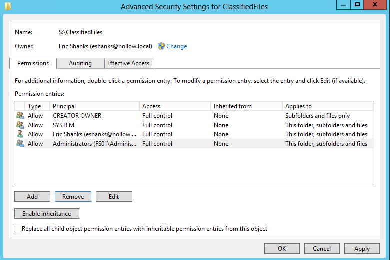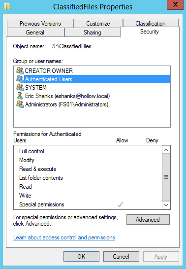 My folder security on “ClassifiedFiles” looks like the below screenshot. Notice that “Authenticated Users” does not have read permissions on the folder.