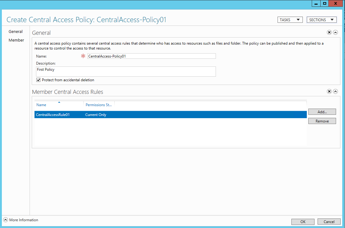 Give the Policy a name and then add a central access rule that you’ve already created to this new Central Access Policy. Notice that a Central Access Policy may contain one to many different central access rules.