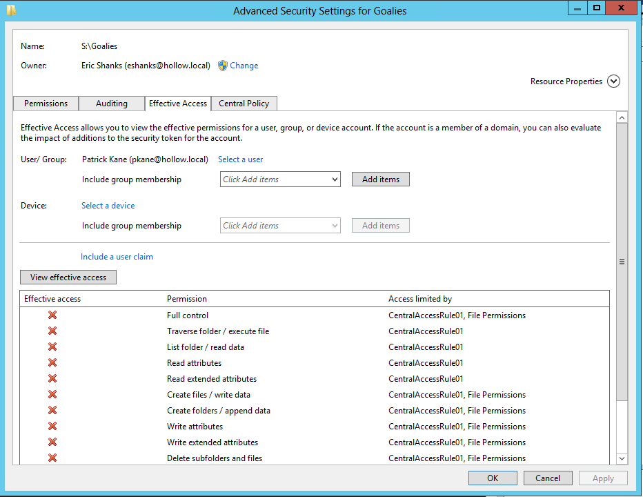Alternatively, we see that Mr. Kane is not a member of the Goalies Security Group so therefore he does not have access.