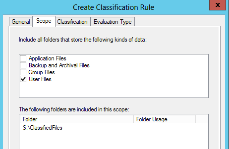 Select what kind of files or folders the rule will be run on. In my example we’re only looking at User files. I’ve also limited the classification rule to run on the “ClassifiedFiles” folder, but you could select entire drives if you’d prefer.