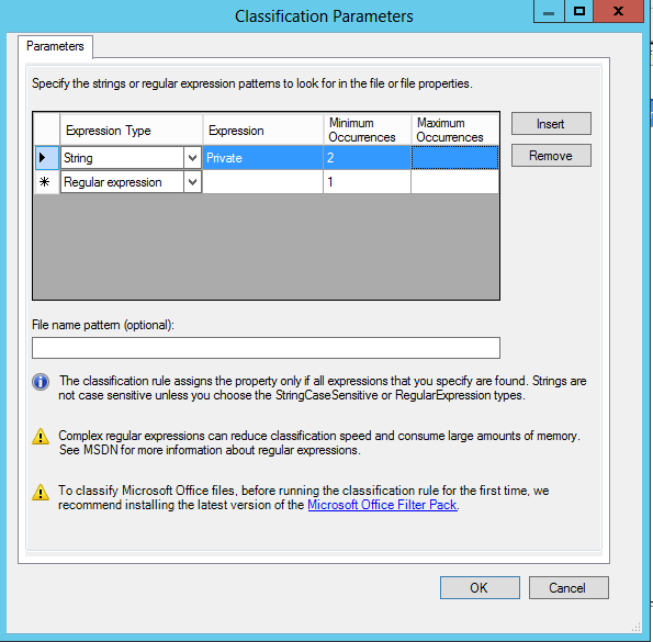 Then we configure the paramaters. This is the logic behind the classification. In my example, I’m looking for any files that have the string “Private” in them two times. In a corporate file store this might not work, but a suitable expression could be found to fit for almost any situation.