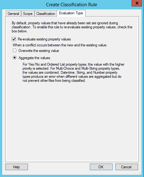 The last step of the configuration is to set an evaluation type. This is a way to handle any files who already have a classification. What should happen to those files? Should you overwrite their classification, add to their classifications or do nothing?