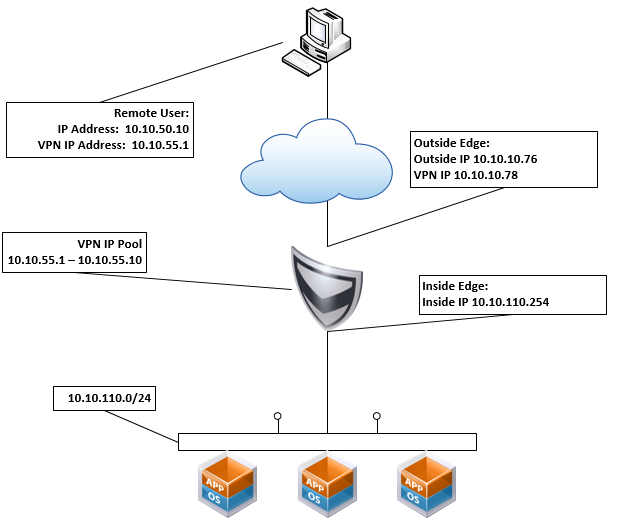 For the lab setup, there is a remote user machine, the vShield Edge Appliance, and the internal network that we’ll VPN into. We also create a pool of IP Address to be used by the VPN devices.