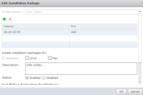Enter a name and a description for the package. The more descriptive the better! The gateway IP Address should be the address of the outside IP address of the vCNS Edge appliance that you configured earlier. It should be noted that the IP address could be a public IP or public DNS address that has been NAT’d through another firewall on the edge of your physical network.