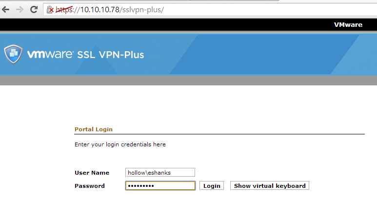 Open a web browser and go to the outside IP address of the vCNS edge appliance that you configured. You should be presented with a logon screen.