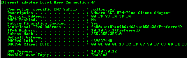 I ran an ipconfig command and it shows that I’ve got a 10.10.55.1 address as I should from the VPN Pool, and I can connect to the private network.