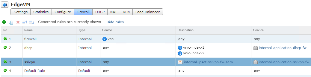 Nothing needs to be configured here, but I wanted to show that a firewall rule is automatically added to the vCNS Edge appliance.
