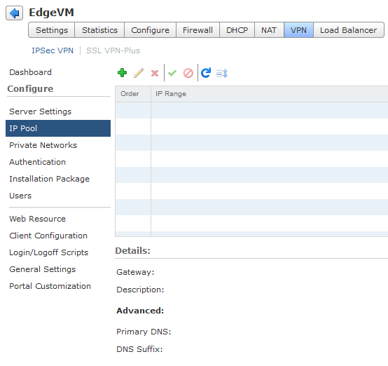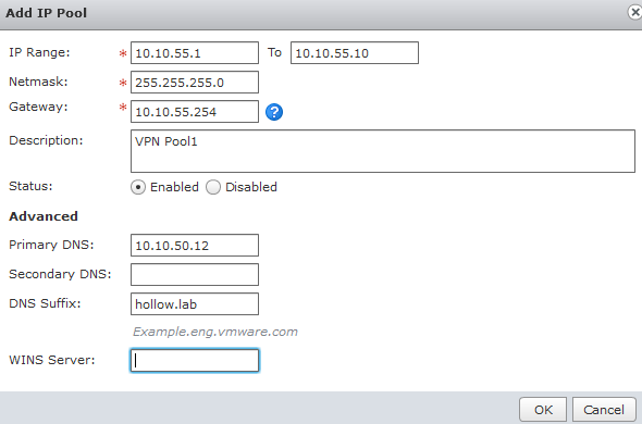 Add a new IP Pool. Enter a range of IP addresses that will be handed out to your VPN Clients. Enter a subnet mask and a default gateway address as well. The IP Range used should not be a range that is already on your vCNS appliance. Also, be sure to enter a subnet mask and a gateway. The gateway IP Address will be assigned as a virtual IP Address on the vCNS Edge appliance.