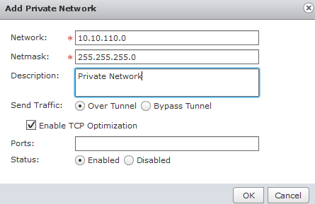 Here, we add the internal network and the subnet mask. You’ll have the option to have the traffic encrypted or not by select the “Over Tunnel” option. The “Enable TCP Optimization” checkbox will enhance the performance of your TCP Packets. You can restrict the network access to specific port numbers by entering them into the “Ports” checkbox. If you don’t enter any, all ports are assumed.