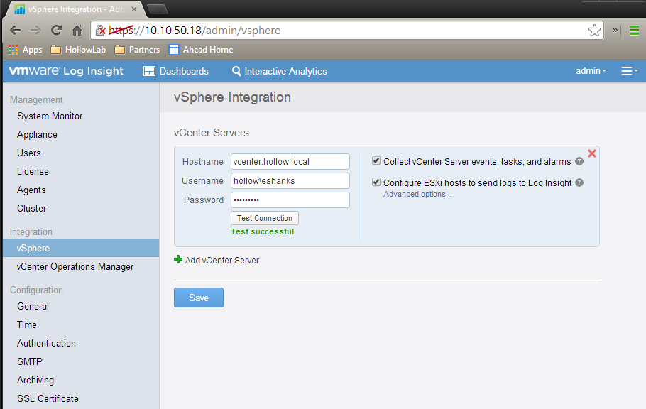 Once you’ve finished deploying the appliance and answering some questions, you’ll need to start listing the items you’ll be collecting logs from. The first and most obvious would be vCenter. When you configure vCenter, it will also try to add any hosts that vCenter is managing and all of the log forwarding will be configured for you. Pretty slick right?