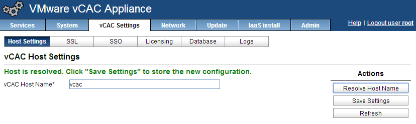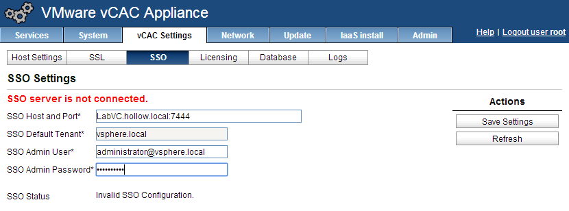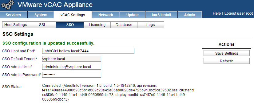 The SSO Page should look similar to this after setting up SSO. I would like to mention that there is an Identity appliance that can be downloaded with vCAC, but you can use your own vSphere SSO appliance if you’d like.