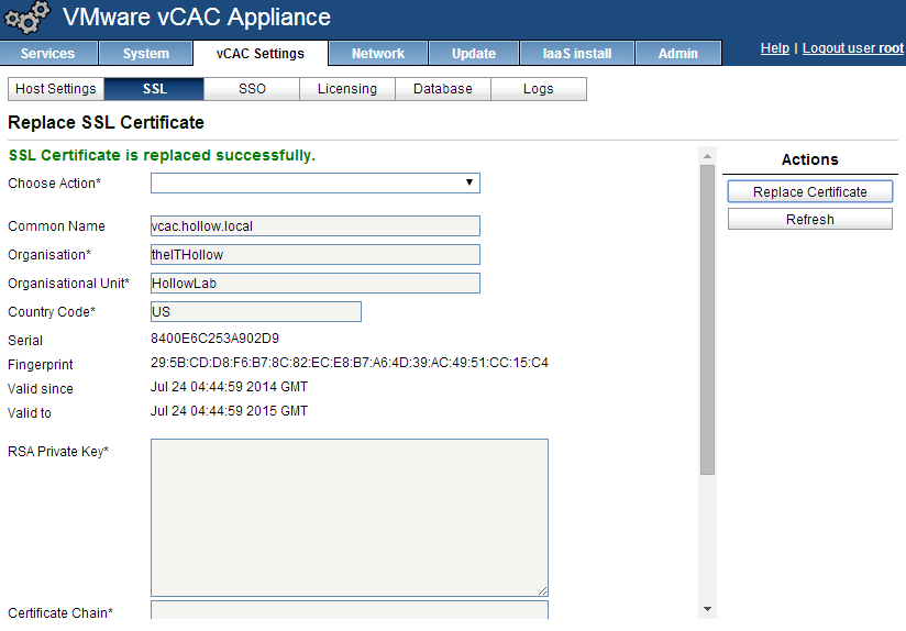 Next click on the SSL Tab. You may see the death wheel again so be patient. Choose your certificate action, enter your certificate information and then click the replace certificate.