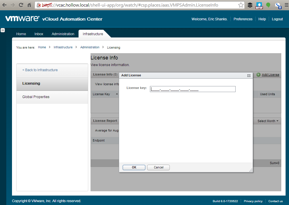 Sorry folks, if you are at this stage and don’t have a license key, you’re probably in trouble. We need to add a valid license key by going to the infrastructure tab –> Administration –> Licensing. Enter your license key so you can continue with your endpoints.
