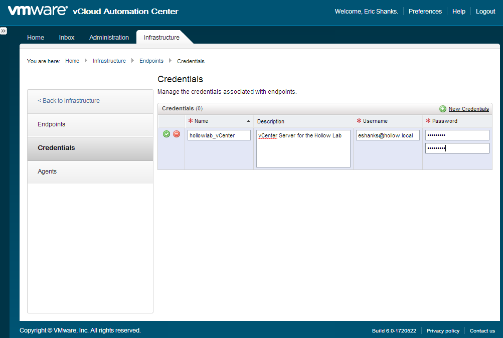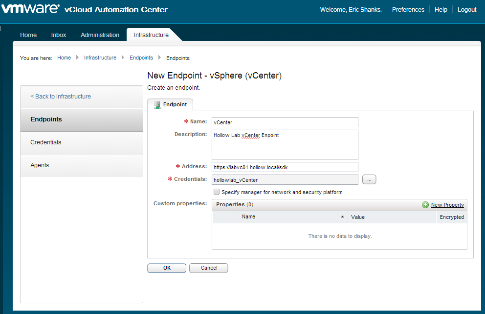 NOTE: the endpoin name, must match the agent we configured during the IaaS components install. If you kept the defaults, you must use the name “vCenter” and YES, the case matters. Capital “C”