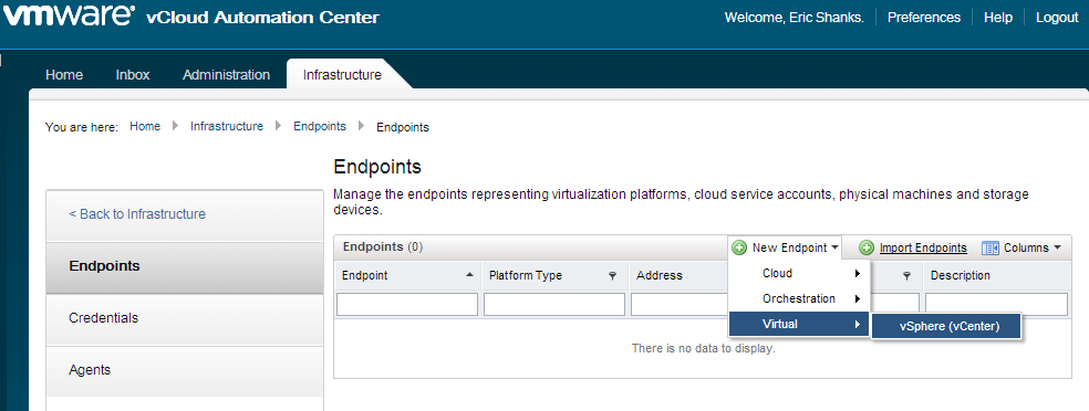 Now we can click on the Endpoint menu and add our vCenter. Click the “New Endpoint” dropdown and go to Virtual –> vSphere (vCenter) option.