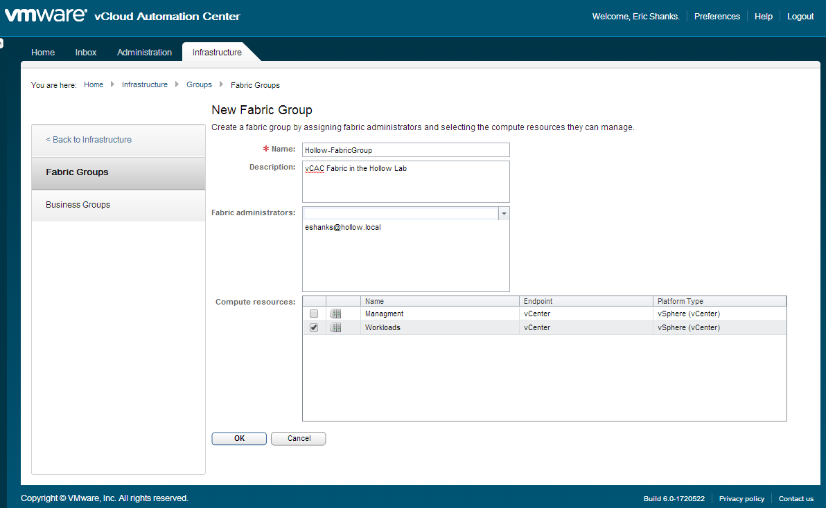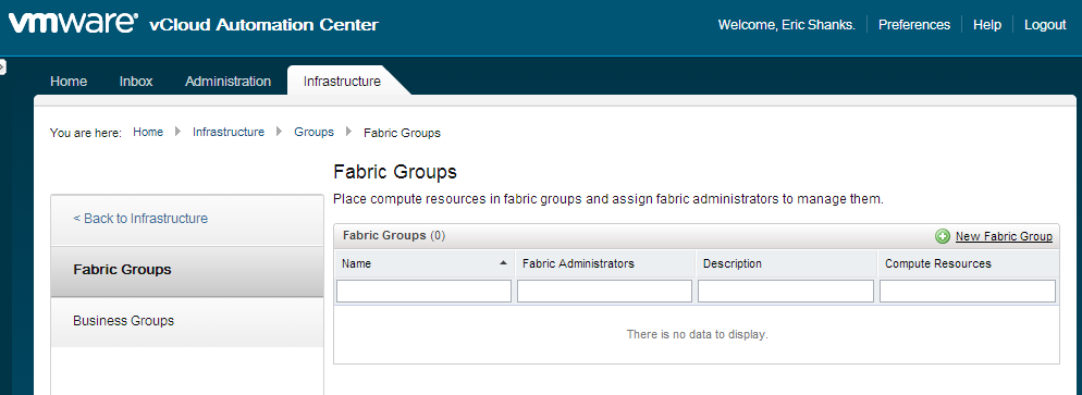 We’ve connected to our vCenter Endpoint, but now we need to setup a fabric group. The fabric group is a set of physical resources that we’re going to store our virtual machines. Go to Infrastructure tab –> Groups –> Fabric Groups. Click the “New Fabric Group” option.