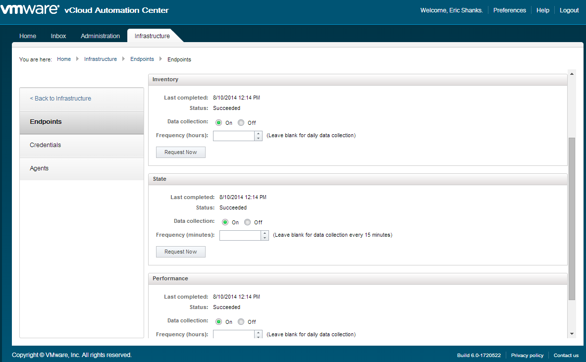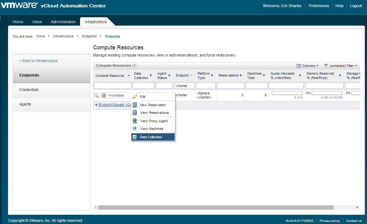 After you setup the fabric group, go to the Infrastructure Tab –> Endpoints –> Endpoint (yes, I know I said that twice) and look for your compute resources. Click the dropdown next to the cluster you just added and go to Data Collection.