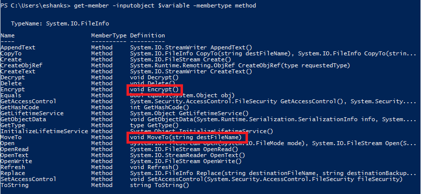 For instance, the Encrypt method has a definition that looks like “Encrypt()”. The parentheses are used to store additional variables. Since Encrypt doesn’t have anything inside the parentheses, there are no options that can be added to the method. See Below, where I’ve used both the Encrypt and MoveTo methods on the file. See that the encrypt method has no additional paramaters, but the MoveTo method needs a new file location.