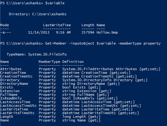 Just like our computer monitors, PowerShell Objects also have properties. Let’s look at our variable again where the bitmap file “Hollow.bmp” was loaded into it.