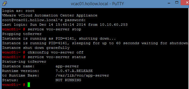Login to your appliance and stop the vco-server service. If you happen to have multiple appliances configured with HA, be sure to stop the services on each of the appliances. You can stop the service by connecting to your appliance via SSH and running service vco-server stop . Next, run chkconfig vco-server off. To check the server status, you can use service vco-server status and make sure the status shows up as “Not Running”.