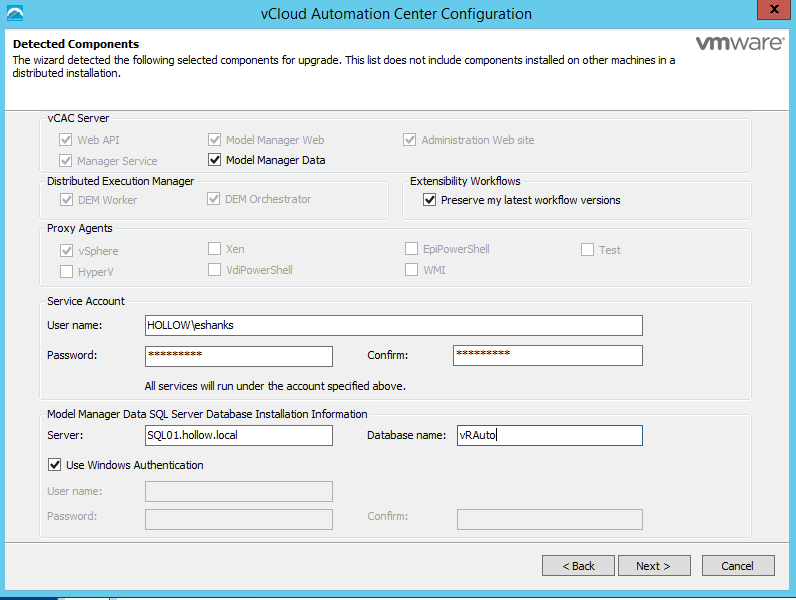 Obviously you should ensure that you’ve got backups in the event something catastrophic should occur. Be sure to grab a backup of the IaaS database, and snapshot your vRA appliances, as well as any of the servers running the IaaS components such as the Model Manager, DEM Workers, Orchestrators and Agents. For this guide, we have a vRA appliance, and a single IaaS Server running the rest of the components. A separate SQL Server is housing the database.