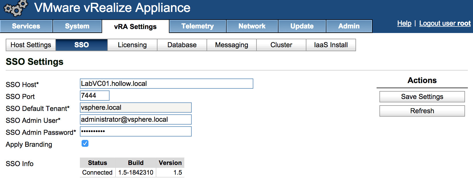 Congratulations! Your vCAC instance has been upgraded to vRealize Automation 6.2. If you would like to change the branding to show “vRealize” instead of the “vCloud Automation Center” you can login to the vRealize Appliance Portal, and go to the vRA Settings tab and then click SSO. Re-enter the SSO Settings, and click the “Apply Branding” checkbox. Click Save Settings.