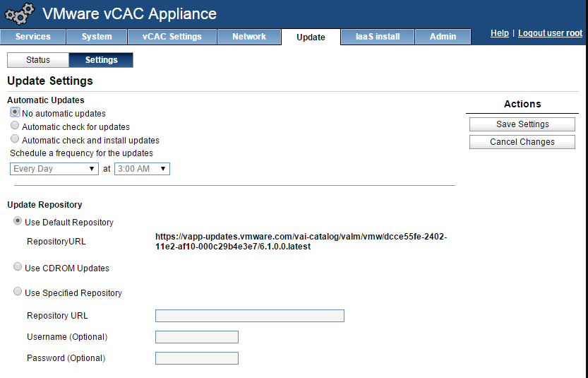 If you don’t want to automatically download the updates, you can download an ISO or zip file and mount a different repository to make the process quicker. Just change the settings on the appliance management portal under the update–> settings tab.
